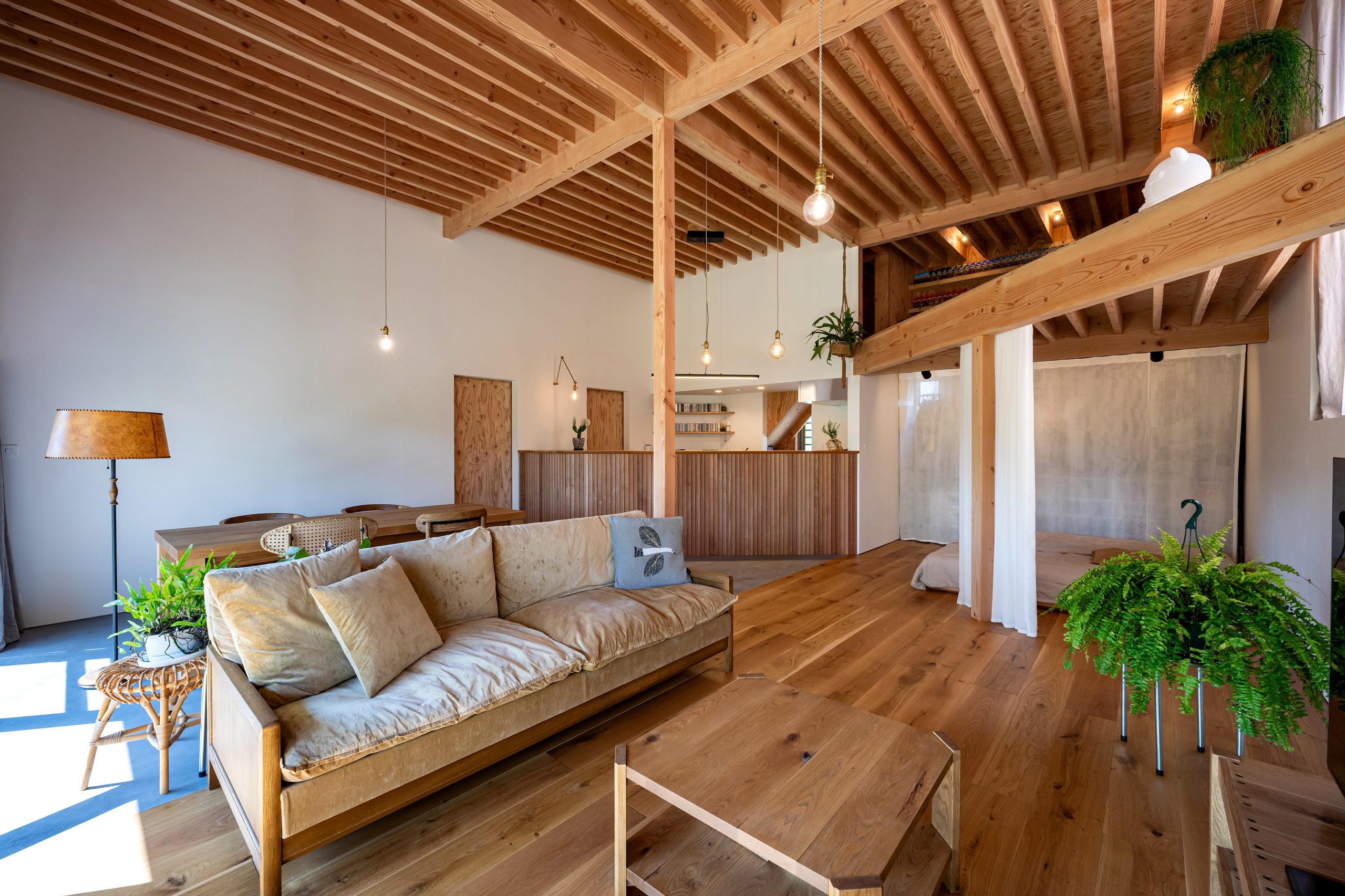 長い間暮らしていく住まいは、ストレスのない心地よい環境であることが必要です。私たちの作る家は健康の大敵であるカビが発生しづらくなっています。また、ホルムアルデヒドなどに代表されるシックハウスの原因になる化学物質を含む素材の使用を出来るだけ避けています。これまで施工させていただいた住宅の内装は全て、漆喰や珪藻土、そして床や天井などはボンドなどで圧着していない無垢材を採用してきました。